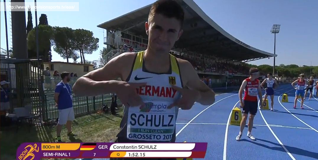 Constantin Schulz lief am 21.07.2017 in Grosseto in einem spannenden Qualifikationslauf die 800 m in 1:52,15 und erreichte damit das Semifinale. Spannend war der Lauf, weil Constantin auf den ersten 500 m in einer ähnlichen Situation steckte wie im Nominierungrennen in Regensburg – er wurde, auf der Innenbahn laufend, regelrecht von seinen Konkurrenten eingeschlossen. Bei ca. ca. 600 m gelang ihm der “Durchbruch”. Nach einer kleinen Drängelei lief er am Feld vorbei. Ein Konkurrent spurtete mit, so dass an dieser Stelle des Laufes das Tempo sichtbar zunahm. Am Ende reichte die Kraft noch aus, um mit einem sicheren 4. Platz das Semifinale zu erreichen.