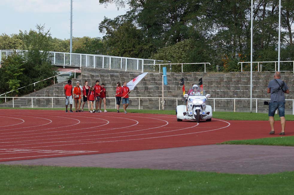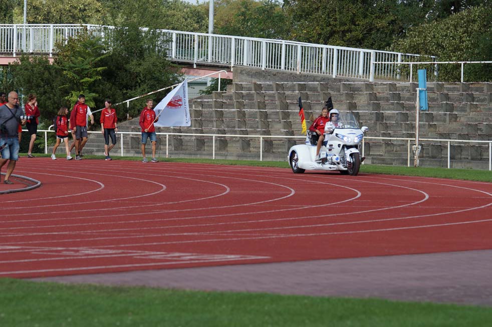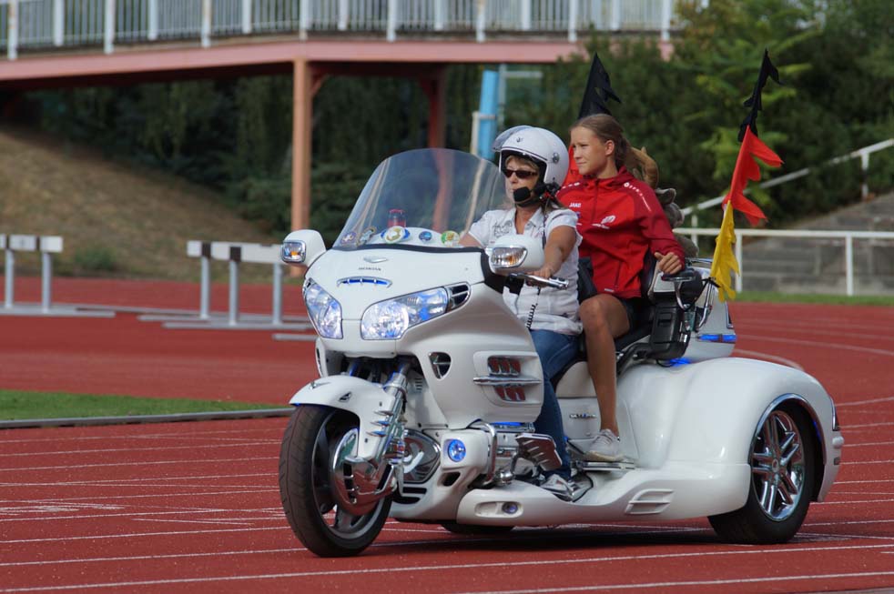 Der feierliche Rahmen wurde gleichzeitig genutzt, um die erfolgreichsten Sportler der vergangenen Wettkampfperiode zu ehren. Auf einem “Dreirad” (Motorrad für Präsentationszwecke) wurde die neue 400m Vizeeuropameisterin U18 Marie Scheppan ins Stadion geleitet, gefolgt von der Vereinsfahne, getragen von Arthur Beimler und weiteren erfoglreichen Athleten.