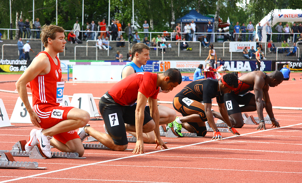Ließ sich von den Fehlstarts nicht aus der Ruhe bringen, LCC-Sprinter Markus Franke (Erster v.l.) :: Foto: Fugmann
