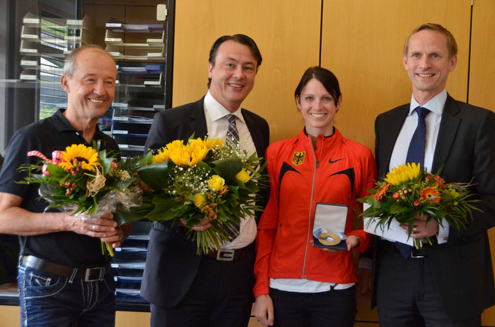 Antje beim Empfang ihres Sponsors dem Sana-Herzentrum mit Vizepräsident Uli Hobeck (li.) und Präsident Vlatko Knezevic (2 v.l.) :: Foto: Helbig